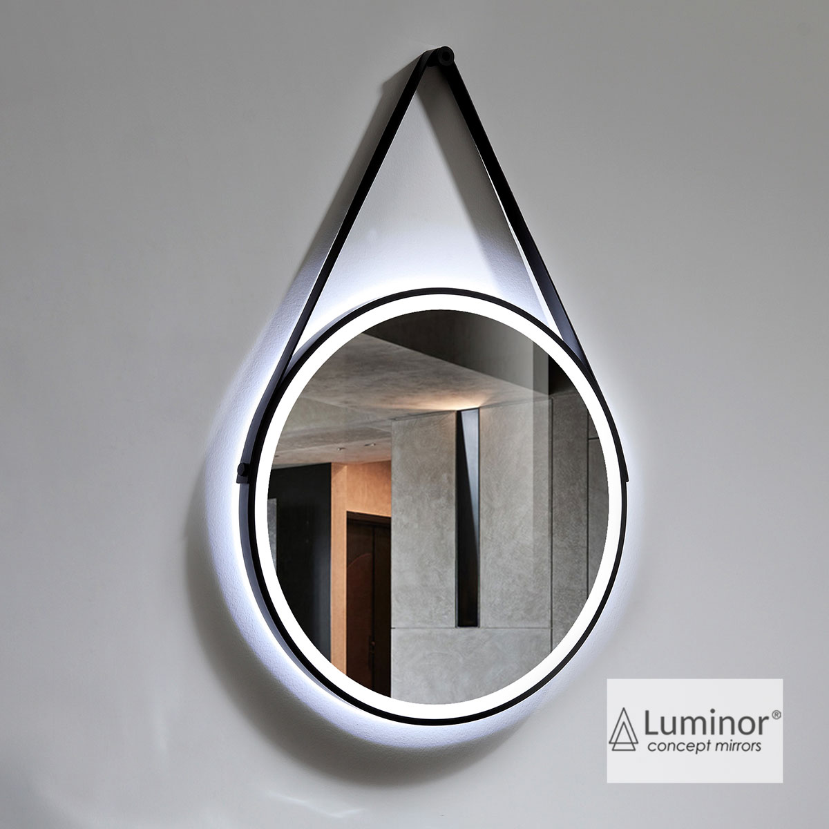 Καθρέπτης FLY, Φ70 εκ. φωτιζόμενος LED, με μαύρο πλαίσιο αλουμινίου, δερμάτινο ιμάντα και επιτοίχια βάση στήριξης, LUMINOR