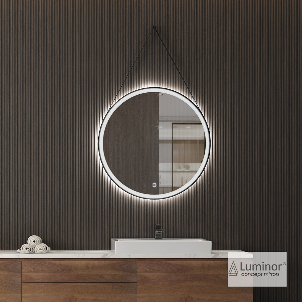 Καθρέπτης FLY, Φ80 εκ. φωτιζόμενος LED, με μαύρο πλαίσιο αλουμινίου, δερμάτινο ιμάντα και επιτοίχια βάση στήριξης, LUMINOR