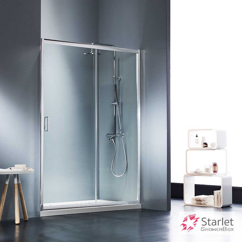 Πόρτα ντουζιέρας STARLET 100 με 1 σταθερό & 1 συρόμενο φύλλο . Διαστάσεις: 97-101 / ύψος 180 εκ. Άνοιγμα εισόδου 41εκ. Κρύσταλλο ασφαλείας Clear (διαφανές) 5 χιλ.