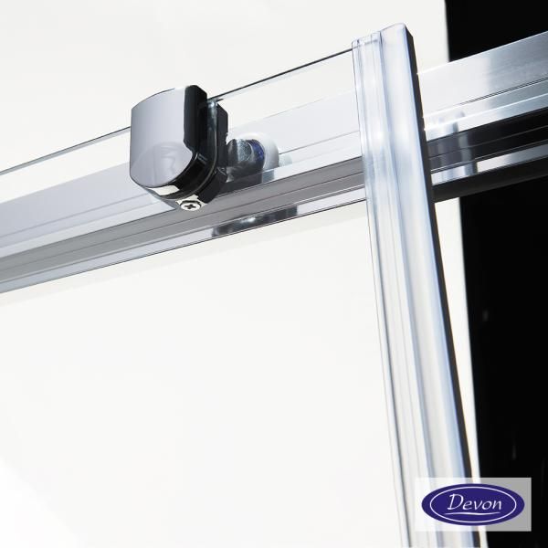 Καμπίνα γωνιακής εισόδου DEVON FLOW CORNER ENTRY 100×110 με 2 σταθερά & 2 συρόμενα φύλλα. Διαστάσεις: 97-99 x 107-109 / ύψος 195 εκ. Άνοιγμα εισόδου 63 εκ. Κρύσταλλο ασφαλείας Clear (διαφανές) 6 χιλ. με επεξεργασία Clean Glass