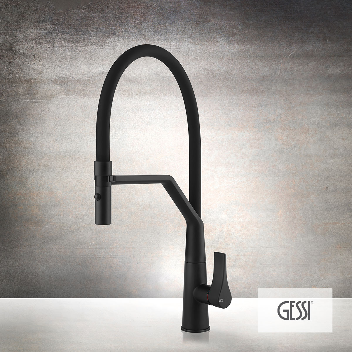 Μπαταρία νεροχύτου θερμομικτική ελατηρίου PROTON υψηλή, με περιστρεφόμενο ρουξούνι και συρόμενο ντους 2 λειτουργιών (shower / spray), GESSI Ιταλίας