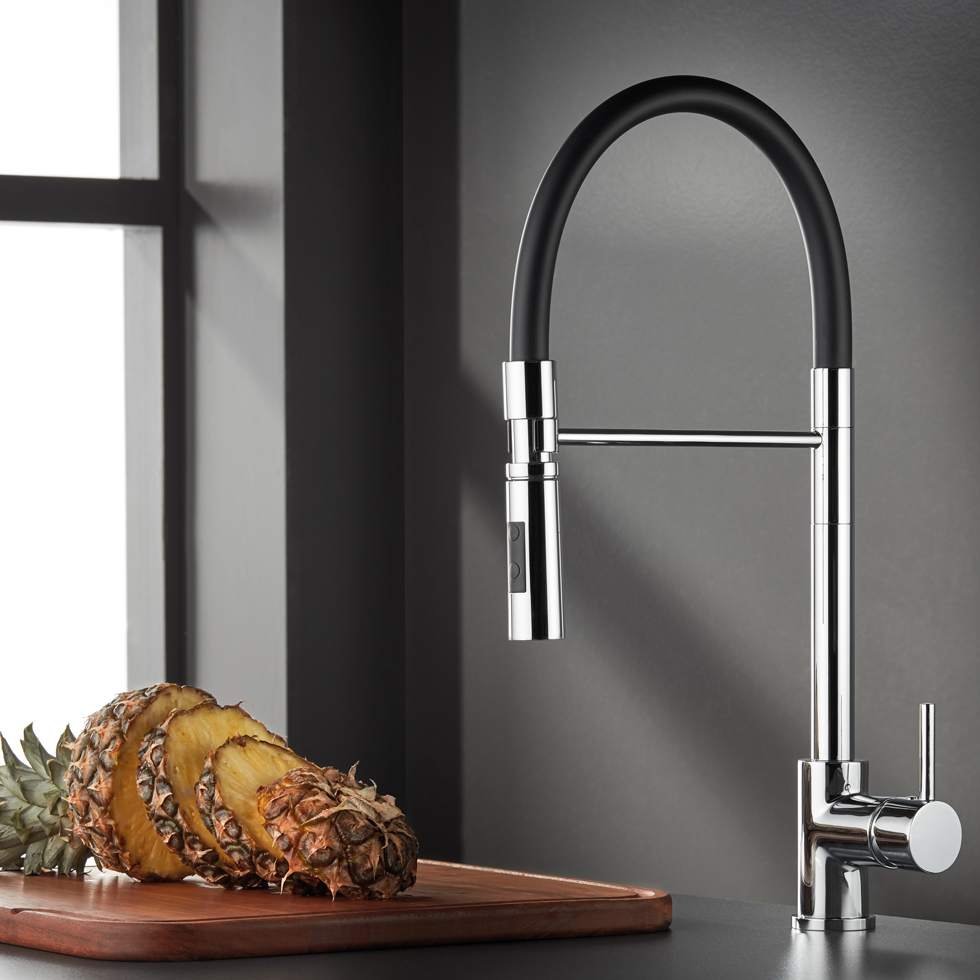Μπαταρία Νεροχύτη FLUO Χρωμέ υψηλή,η οποία διαθέτει περιστρεφόμενο ρουξούνι με εύκαμπτο σωλήνα ντους 2 λειτουργιών (shower / spray) και είναι κατάλληλη για νησίδες. Έχει ύψος 49,4 εκ. και προβολή 26,1 εκ.