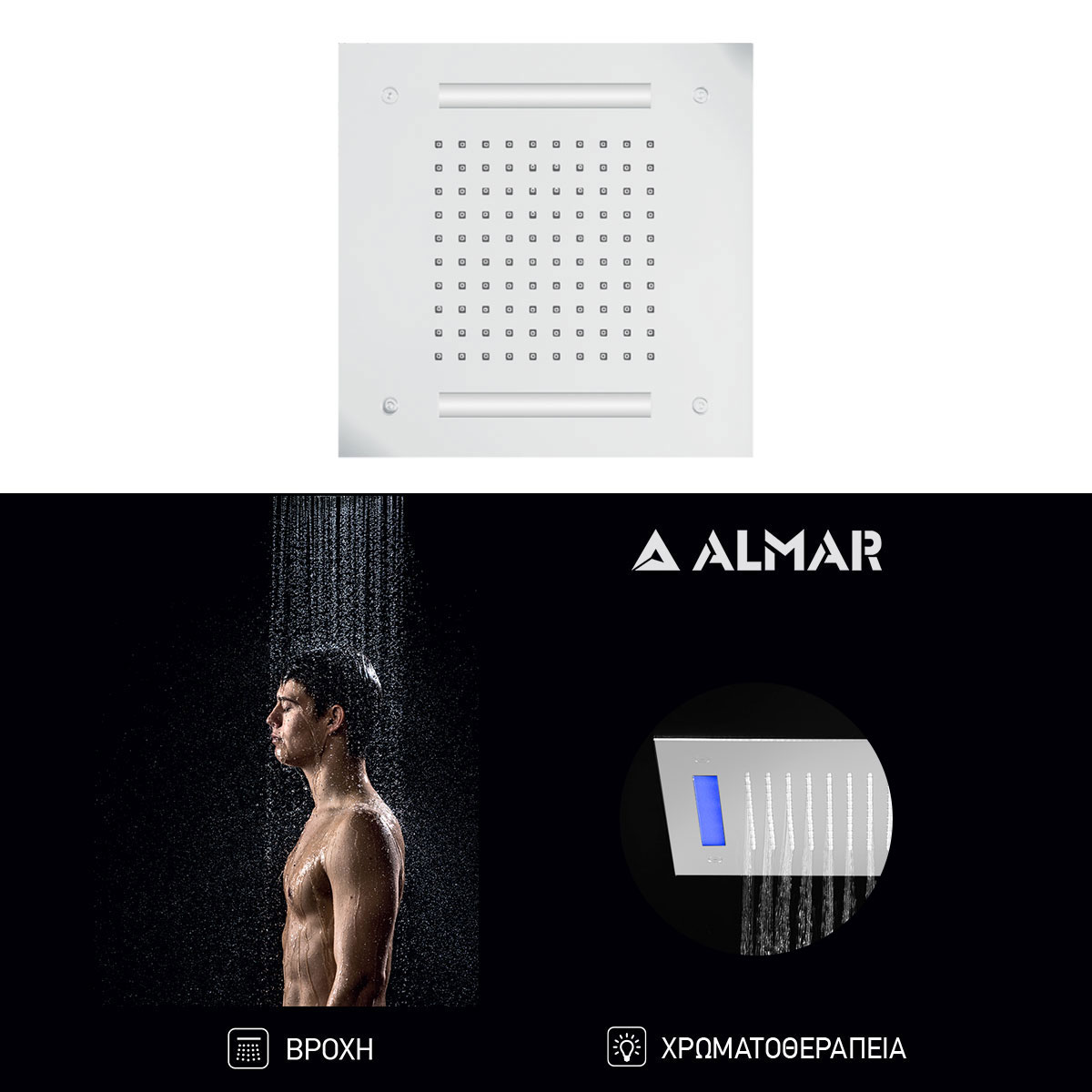 Κεφαλή Ντουζ Εντοιχισμού Οροφής 30×30 με Χρωματοθεραπεία, Almar White Matt