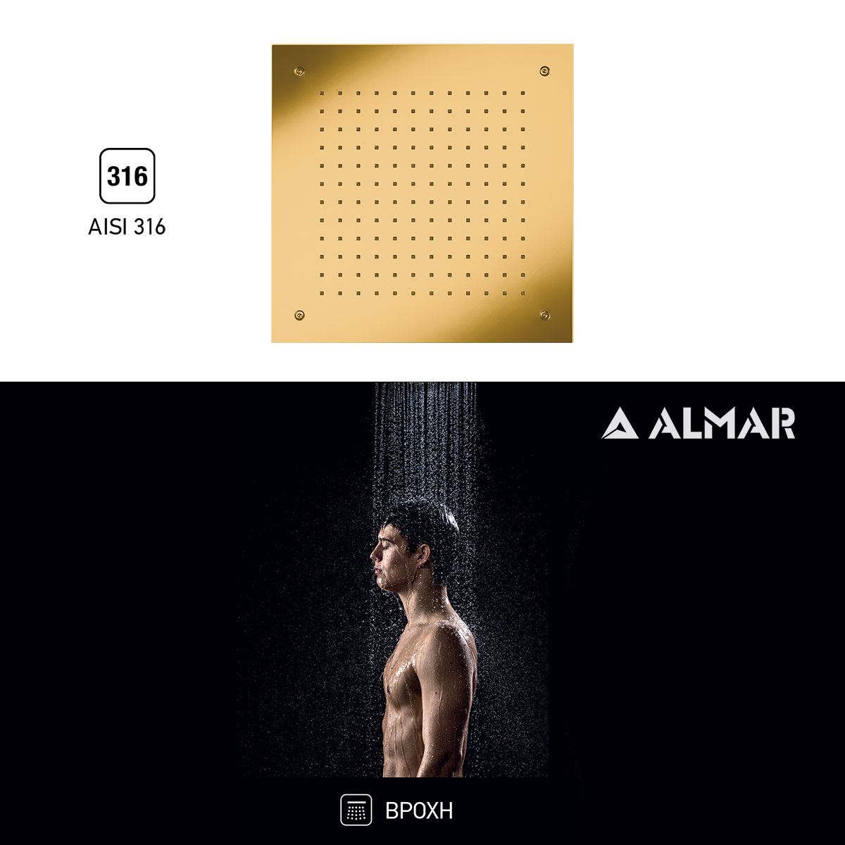 Κεφαλή ντους οροφής εντοιχισμού Temptation τετράγωνη 38×38 εκ. από ανοξείδωτο ατσάλι AISI316, Almar Ιταλίας