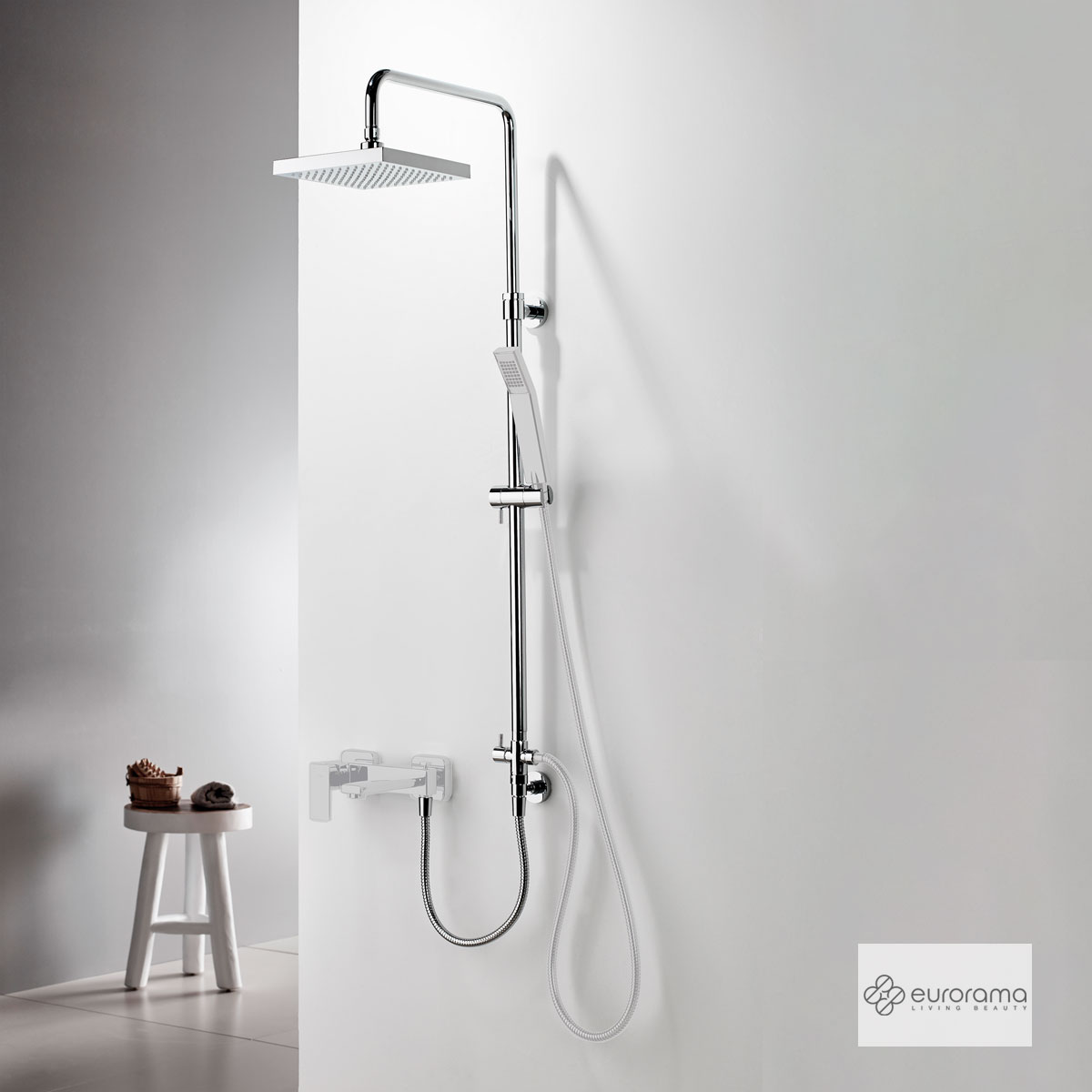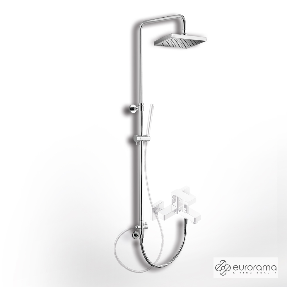 Κολώνα για σύνδεση με μπαταρία λουτρού. Ρυθμιζόμενο ύψος 83-144 εκ. με ανακλινόμενη κεφαλή anticalcare 20×20 εκ., εκτροπέα, στήριγμα τηλεφώνου & άθραυστο σπιράλ 60 εκ., Eurorama Ιταλίας