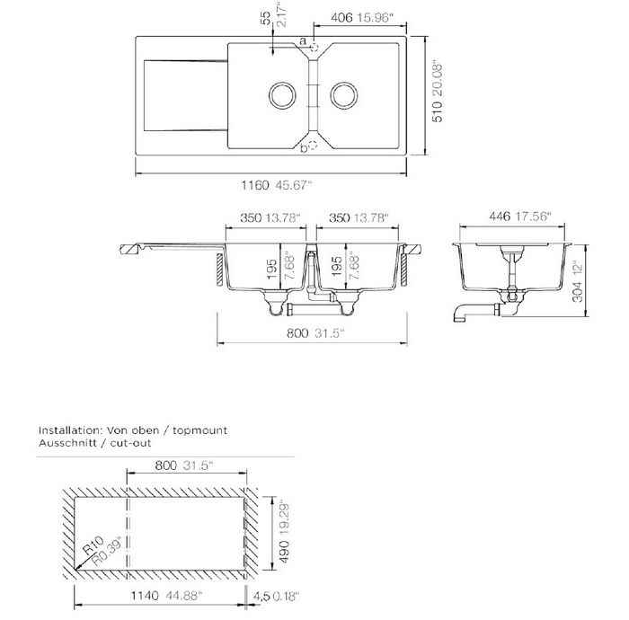 Νεροχύτης granite 116×51 της σειράς CRISTALITE MANHATTAN με μια γούρνα μεγάλη ,μια γούρνα μικρή και ένα πάγκο εργασίας για ερμάριο 90 εκ., SCHOCK Γερμανίας