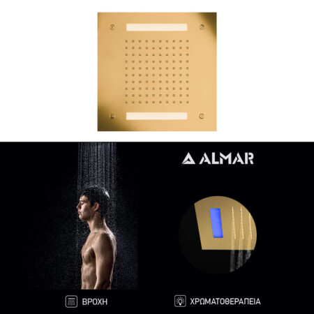 Κεφαλή Ντουζ Εντοιχισμού Οροφής 30×30 με Χρωματοθεραπεία, Almar PVD Brushed Gold