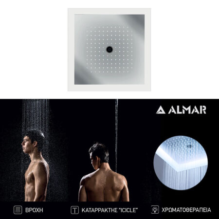 Κεφαλή Ντουζ Εντοιχισμού Οροφής 47×47 Icicle με Χρωματοθεραπεία χωρίς πλαίσιο στήριξης, Almar Inox Chrome
