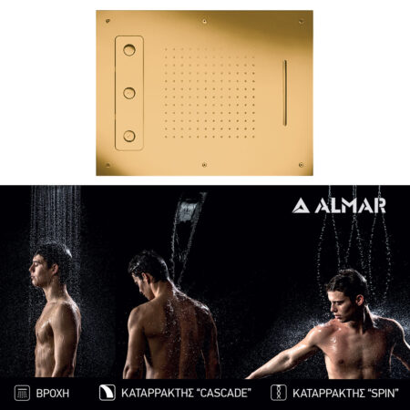 Κεφαλή Ντουζ Εντοιχισμού Οροφής 63×48 με Σύνδεση Bluetooth και Χρωματοθεραπεία, Almar Inox PVD Brushed Gold