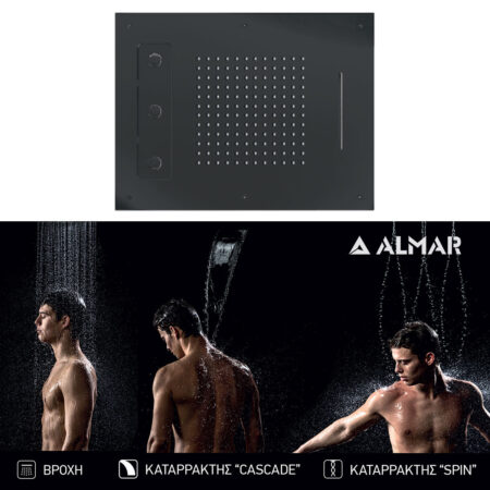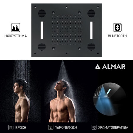 Κεφαλή Ντουζ Εντοιχισμού Οροφής 63×48 με Σύνδεση Bluetooth και Χρωματοθεραπεία, Almar PVD Black Brushed