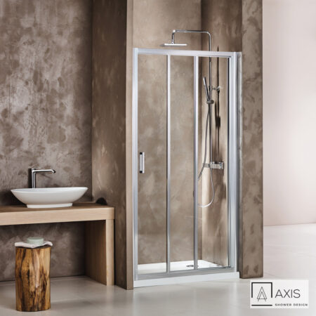 Πόρτα ντουζιέρας AXIS TRIPLE SLIDER 110 με 1 σταθερό & 2 συρόμενα φύλλα. Διαστάσεις: 107-111 / ύψος 185 εκ. Άνοιγμα